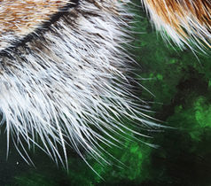 Acrylic and oil on canvas. The piece depicts a captivating portrayal of a tiger in dramatic hues of orange and black, showcasing its majestic presence.