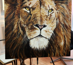 Acrylic on Canvas."Genesis" presents a frontal portrait of a majestic male lion, portrayed in a semi-realistic-modern style. The powerful gaze of the king penetrates the viewer's soul. The painting technique aligns with its name in a primal, less precise, and meticulous style compared to the other works in the series.